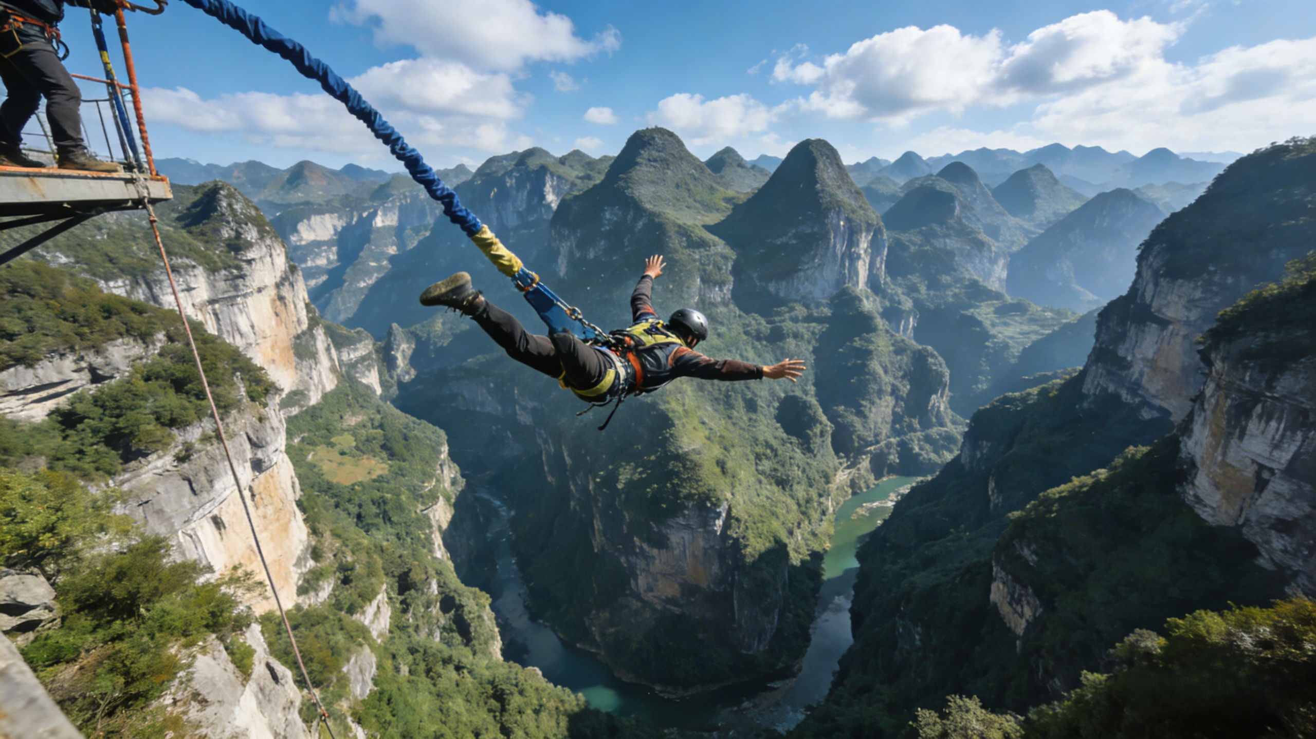 one of the world’s highest bungee jumping points, with a height of 370 meters. When jumping down, the waterfall mist hits the face, dancing with the giant Huangguoshu Waterfall, and the excitement index is explosive!